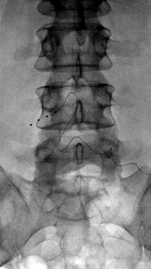 Xray showing DRG stimulator wire in placeThe lead that carries stimulating pulses to the DRG is put in under local anaesthetic. When the skin has been numbed, a needle is passed into the space near the DRG and the lead is fed through it and guided into place using Xrays.