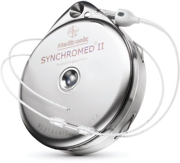 Intrathecal Drug Delivery (ITDD) systems are used for the treatment of spasm and spasticity, and chronic severe malignant and non-malignant pain. There is a small space around the spinal cord called the 'intrathecal space' which is normally filled with a watery fluid called cerebrospinal fluid (CSF). ITDD systems deliver medication into the CSF surrounding the spinal cord. Because the medication is being delivered directly to the site of action only very small doses are required. This means that side-effects are minimised as there is very little medication elsewhere in the body.